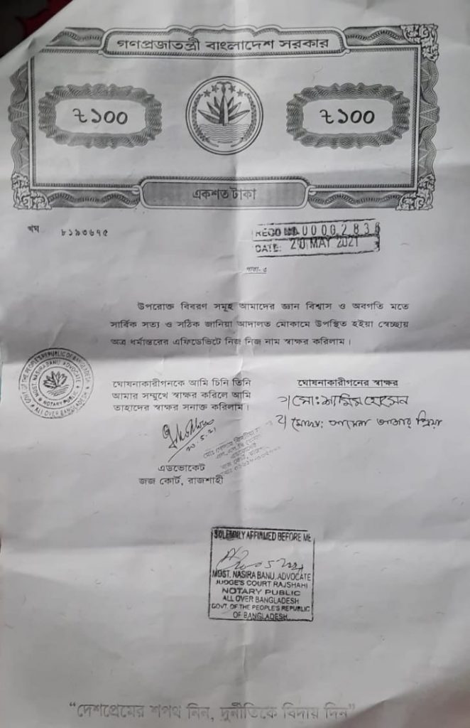 স্টাফ রিপোর্টার রাজশাহী : রাজশাহীনগরীর বোয়ালিয়া থানা এলাকার একটি পরিবার সপরিবারে হিন্দু ধর্ম পরিত্যাগ করে স্বেচ্ছায় ইসলাম ধর্ম গ্রহণ করেছেন । গত ২০ মে তারা রাজশাহীর নোটারি পাবলিক কার্যালয়ে হাজির হয়ে হিন্দু সনাতন ধর্ম পরিবর্তন করে ইসলাম ধর্ম গ্রহণ করেন। তাদের দুই নাবালকের পক্ষে হলফকারী শিশুর পিতা শ্যামল কুমার সরকার। জানা যায়, রাজশাহী নগরীর বোয়ালীয়া থানার সাগড়পাড়া এলাকার মৃত সরজ চন্দ্র সরকারের ছেলে শ্যামল কুমার সরকার (২১) ও তার স্ত্রী প্রিয়া সরকার (২০), তাদের দুই সন্তান, বিশ্বজিৎ সরকার ও রজিৎ সরকার ইসলাম ধর্ম গ্রহণ করেছেন।