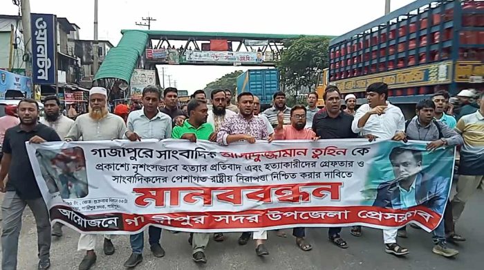 গাজীপুরে প্রকাশ্যে চাপাতি দিয়ে কুপিয়ে সাংবাদিক আসাদুজ্জামান তুহিনকে হত্যার প্রতিবাদে মানববন্ধন করে গাজীপুর সদর উপজেলা প্রেসক্লাব। শুক্রবার (৮আগস্ট) বিকেল ৪টায় হোতাপাড়ায় উক্ত মানববন্ধন শেষে বিক্ষোভ মিছিল নিয়ে গাজীপুর সদর উপজেলা